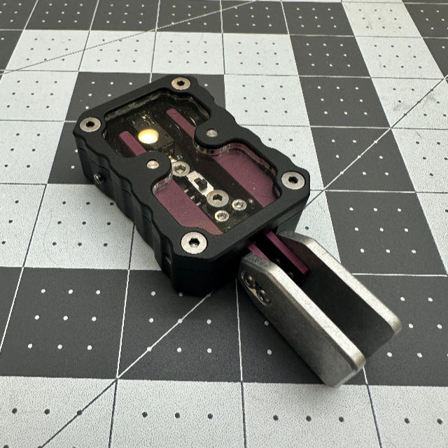 - The body, arms, and finger pieces are made of 6061 Aluminum. An FR4 PCB is housed inside. The bearings are made of steel (specifications available upon request). The clear insert on the top is polycarbonate. All hardware is stainless steel. The magnets are Neodymium. The protective Cerakote coating gives the body and arms their color.
